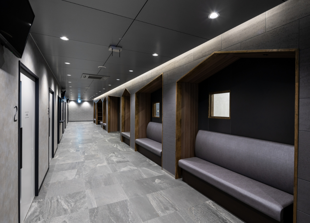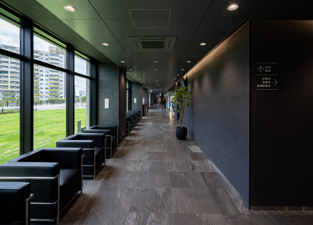 既存病院は地域から閉ざされるよう中庭側に建物が向いていたが、新病院では地域に開かれた病院をつくりだすため、芝生広場を街に向けた前面に配置し、内部空間とともに様々な地域の行事などに対応する計画とした。地域との接点を大切にしながら、患者の心理状態やプライバシーにも配慮した計画とし、都市型精神科病院の新たなあり方を目指している。新病院は建替ステップによりⅠ期棟、Ⅱ期棟に分けて建設。道路からのアプローチのアイストップを兼ねたⅡ期棟には、病棟階に食堂・作業療法室、1 階にはイベントスペースと会議室を配置した。夜にはⅡ期棟の外壁を優しくライトアップし、地域に開かれた病院のシンボルとして、街に潤いをもたらしている。
